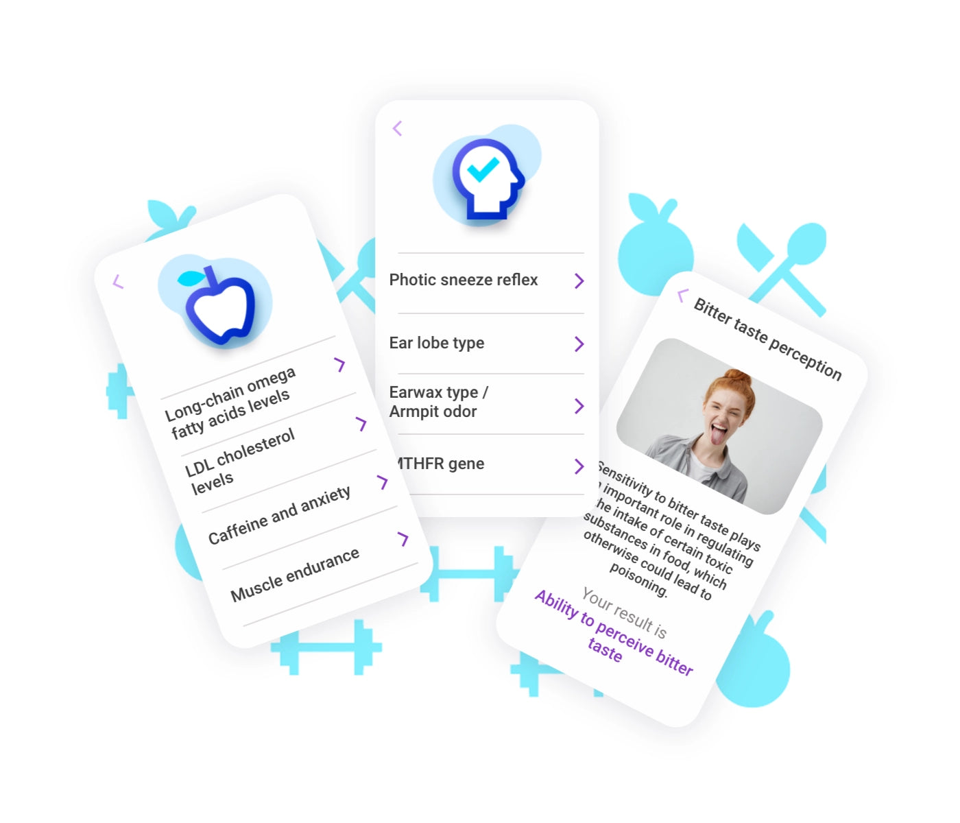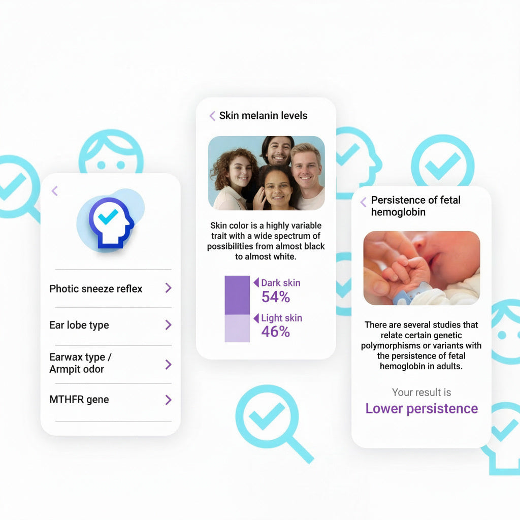 - აღმოაჩინე გენეტიკური დეტალები თუ როგორია შენი - სუნების აღქმა, სიცივისადმი მგრძნობელობა, მეტაბოლიზმის სიჩქარე, ორგანიზმის რეაგირება ჰორმონებზე და ალერგენებზე.